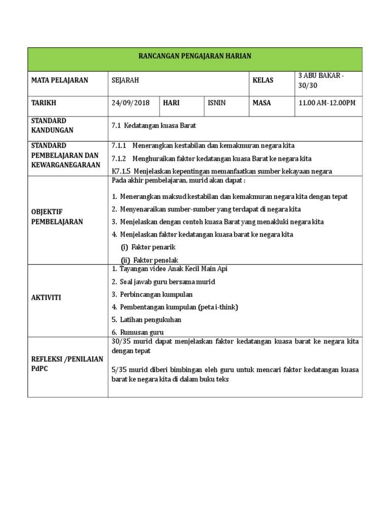 7 1 Kedatangan Kuasa Barat Rancangan Pengajaran Harian Sejarah Mata Pelajaran Dan Kelas Masa Tema Standard Kandungan