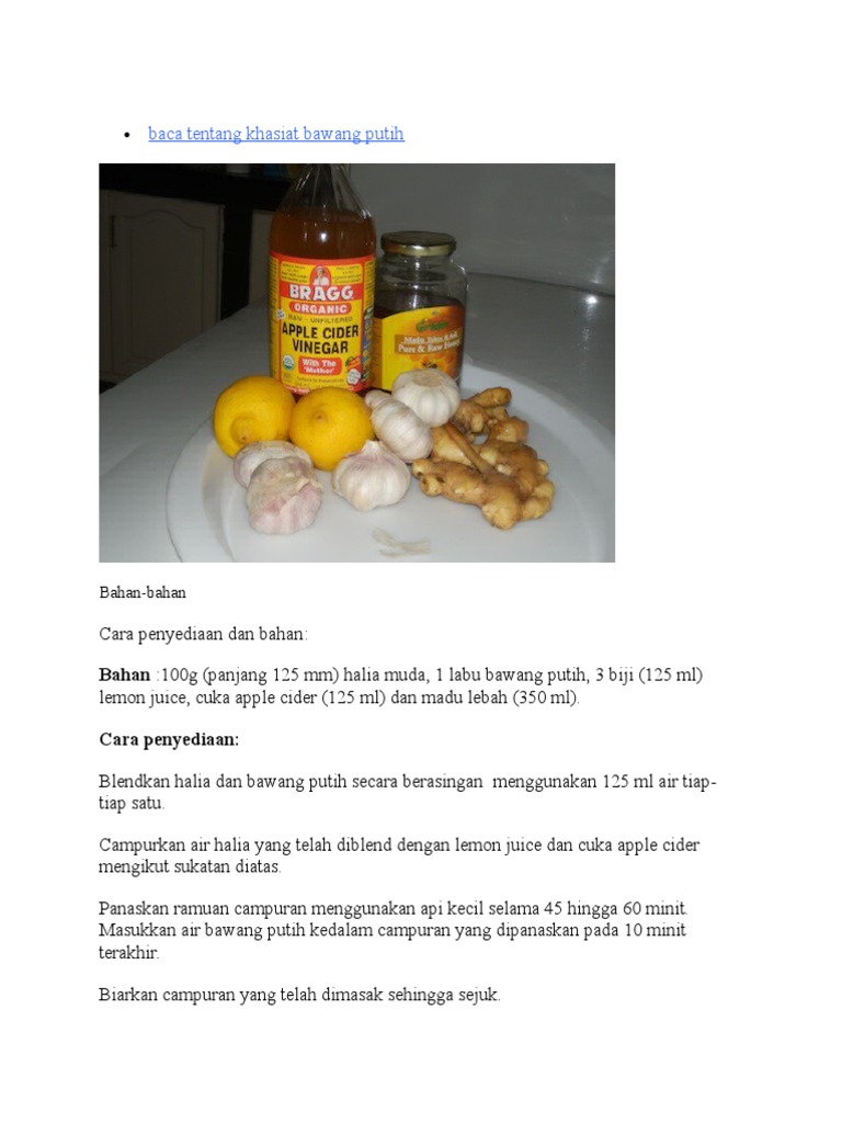 10 mengurangkan sakit kepala. Halia mengandungi mineral kromium magnesium dan zink yang membantu dalam meningkatkan kitaran darah dan juga menghalang daripada demam dan peluh yang berlebihan. Dilansir dari very well fit selasa 30 7 pakar kesehatan dan spesialis gizi kebugaran dari amerika serikat malia frey mengatakan bawang putih allium sativum lemon dan madu juga cocok dicampur dengan bawang putih karena bisa menutupi aroma bawang putih yang tidak.