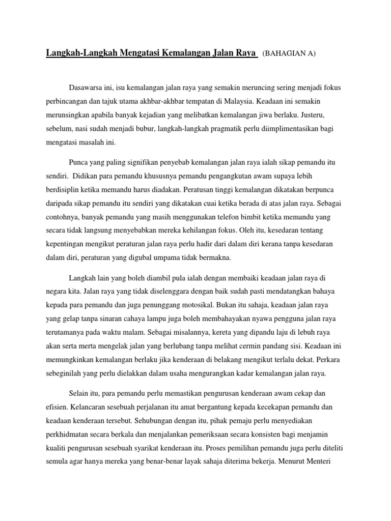 Langkah langkah mengurangkan kemalangan jalan raya ulasan. Oleh itu wajar untuk kita bincangkan apakah langkah langkah yang perlu dilaksanakan bagi mengatasi kesesakan jalan raya. Antaranya kita hendaklah memandu tidak melebihi had laju yang telah ditetapkan. Antara langkah utama dalam mengurangkan kadar kemalangan jalan raya ialah memperbaiki sikap pemandu itu sendiri.