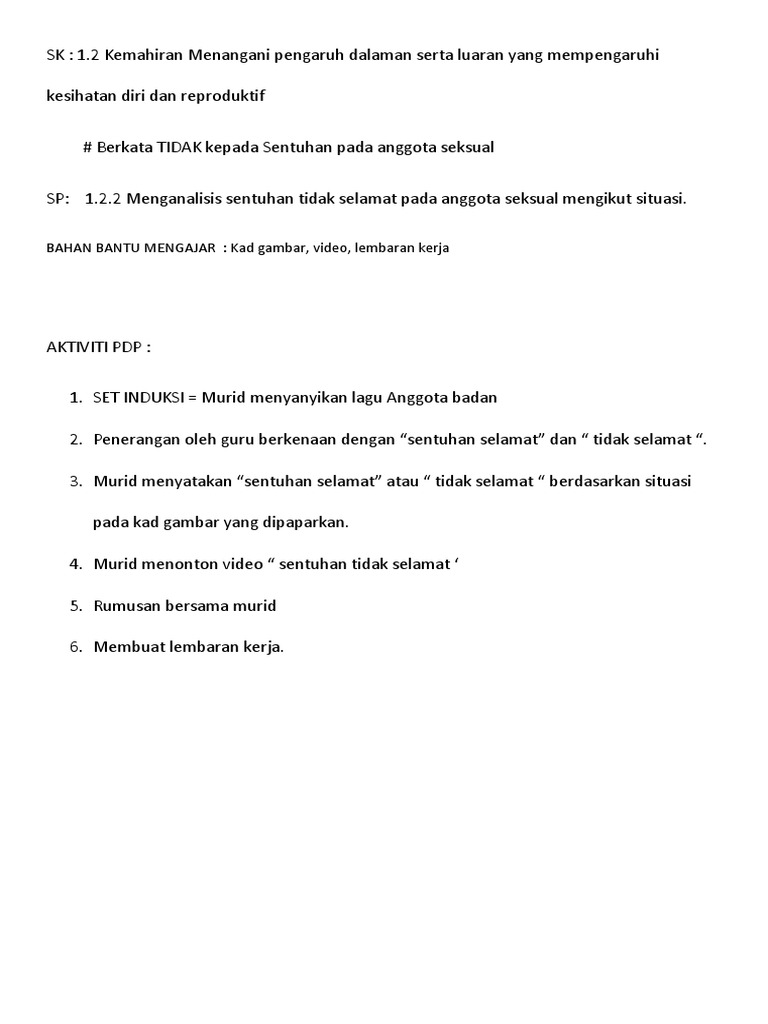 M s 1 12 2 1. Video ringkas yang menerangkan mengenai sentuhan yang selamat dan sebaliknya serta panduan kepada adik adik apa yang seharusnya dilakukan sekiranya berlaku p. Kenal pasti situasi sentuhan selamat dan tidak selamat.