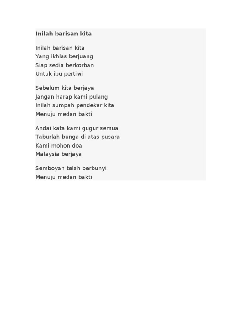 Sebelum kita berjaya jangan harap kami pulang inilah sumpah pendekar kita menuju medan bakti. The song is remarkable for its impartial egalitarian lyrics which extols the soldiers love and duty to the motherland without explicit reference to any particular race or religion. Lirik lagu inilah barisan kita lagu patriotik.