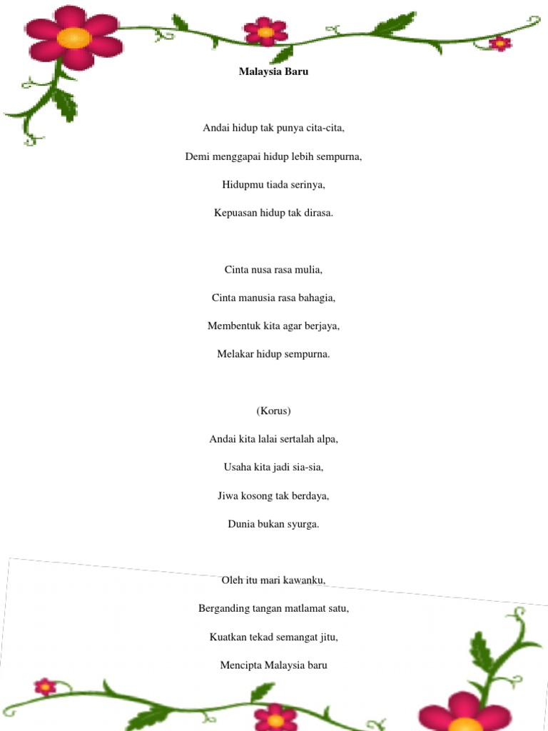 Malaysia baru malaysia baru andai hidup tak punya cinta pada bangsa maupun wanita hidup tak punya ertinya kenikmatan tidak dirasa cinta bangsa rasa mulia cinta wanita rasa bahagia menjadi kita penuh daya mencipta hidup sempurna korus andai kita lalai sertalah lupa masa akan lari sia sia jiwa kosong tak berharga dunia bukan syurga oleh itu. Andai hidup tak punya cinta pada bangsa maupun wanita hidup tak punya ertinya kenikmatan tidak dirasa. Lirik lagu nyanyian achey.