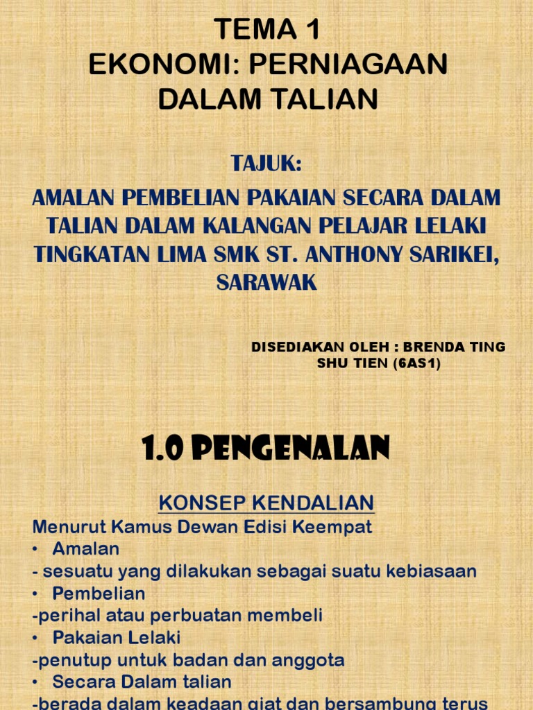 Rumusannya berdasarkan perbincangan dan dapatan di atas maka istilah yang tepat digunakan untuk merujuk kepada online ialah dalam talian. Perniagaan adalah ekonomi kapitalis yang utama. Perniagaan dalam talian menurut kamus dewan bahasa edisi yang keempat perniagaan elektronik e niaga atau perniagaan internet adalah suatu kaedah perniagaan yang membolehkan seseorang berniaga melalui internet atau ict konsep perniagaan internet tidak jauh berbezanya dengan perniagaan konvensional.