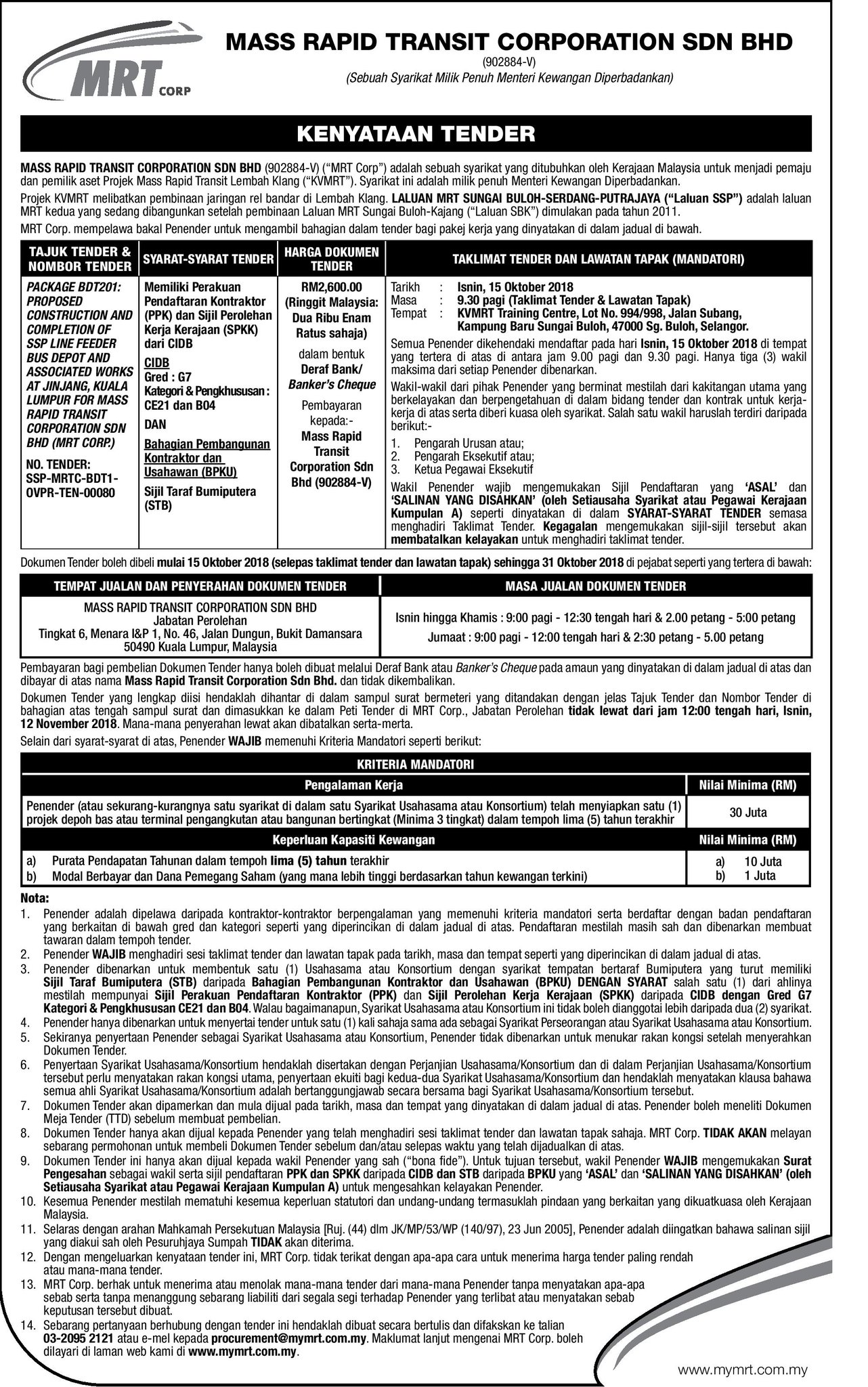 Consultation works under muhibbah engineering m bhd has been awarded a rm189 million work package by mass rapid transit corp sdn bhd for the construction of the mrt sungai buloh serdang putrajaya line also known as mrt2. The company was set up in september 2011 and took over the ownership of the project in october 2011 from prasarana malaysia berhad. Continuation of intermittent lane closures along persiaran apec cyberjaya and puchong bound date.