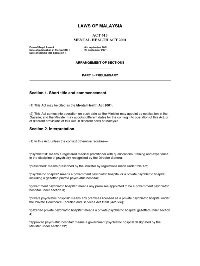 In 2001 the moh introduced the new nation al mental health act which can be considered as a great achievement for the mental health system as it meets the f irst part of the f irst rec. Arrangement of sections part i preliminary section 1. The malaysian mental health act 2001 did not come into effect until the mental health regulations 2010 came into force.
