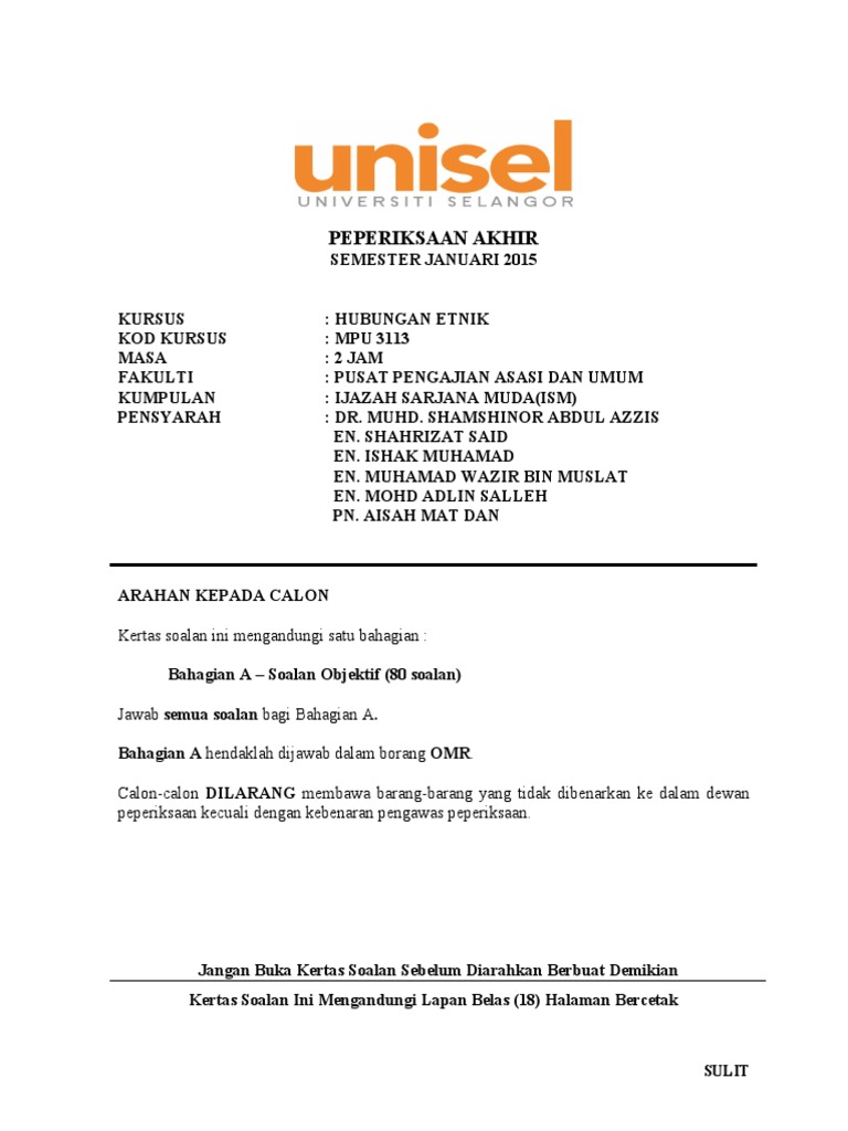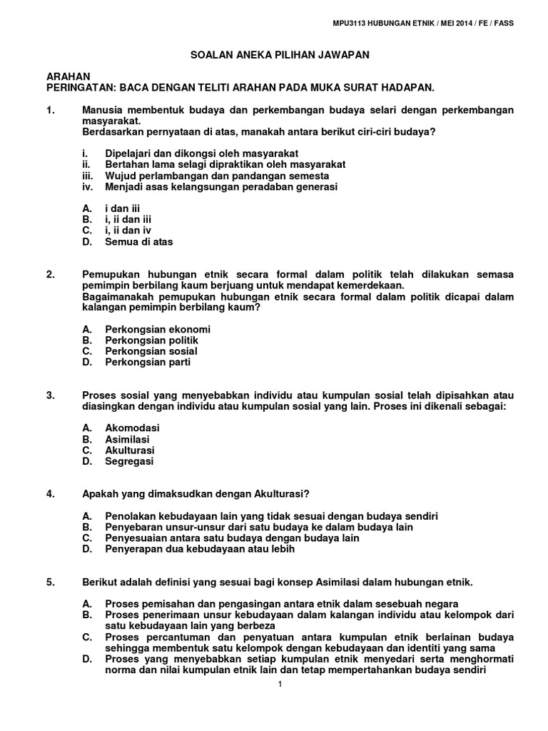 315219334 Contoh Soalan Hubungan Etnik Dan Jawapan Mpu 3113 Hubungan Etnik Peperiksaan Akhir Semester Bahagian A Soalan Objektif 40 Markah Arahan Course Hero