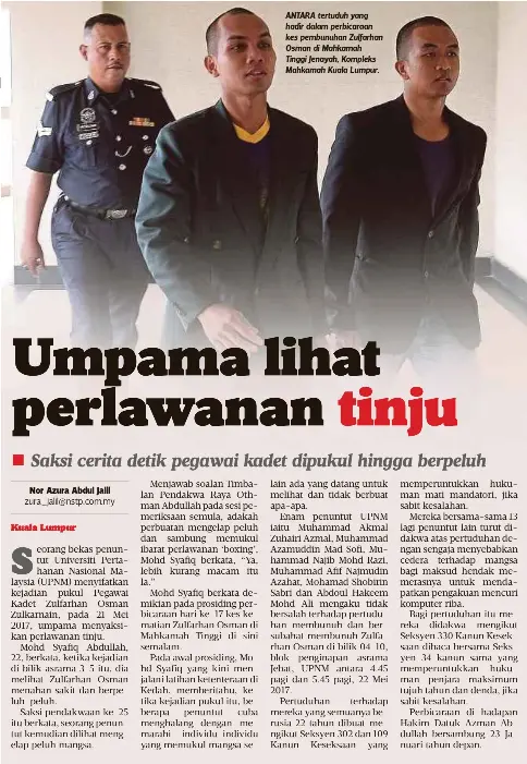 Five of the accused akmal azamuddin muhammad najib mohd razi muhammad afif and mohamad shobirin sabri are charged with murder while hakeem is charged with abetting in the murder of zulfarhan. Muhammad najib mohd razi 23 said the incident began when he was heading to bed in room 4 10 at the jebat hostel block upnm at 5am on may 22 2017. Lima tertuduh iaitu muhammad akmal zuhairi azmal muhammad azamuddin mod sofi muhammad najib mohd razi muhammad afif najmudin azahat dan mohamad shobirin sabri berdepan pertuduhan membunuh zulfarhan manakala abdoul hakeem mohd ali didakwa bersubahat membunuh.