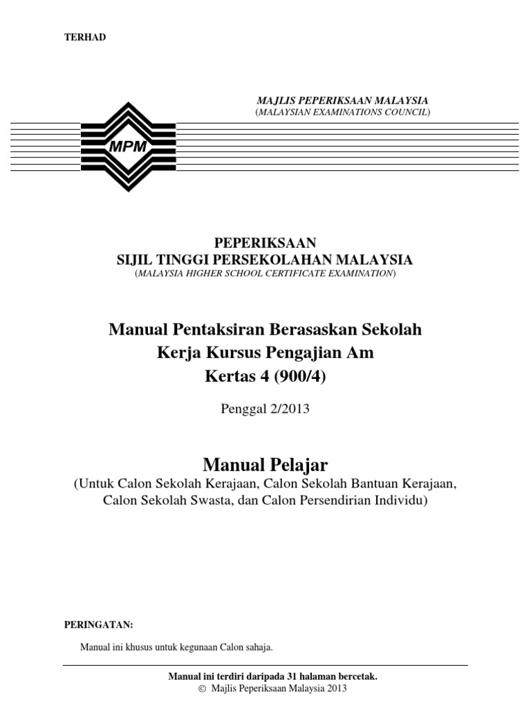 Pdf Terhad Terhad Manual Pelaksanaan Kerja Kursus Pengajian Am Kertas 4 900 4 Majlis Peperiksaan Malaysia Muhammad Syakir Academia Edu